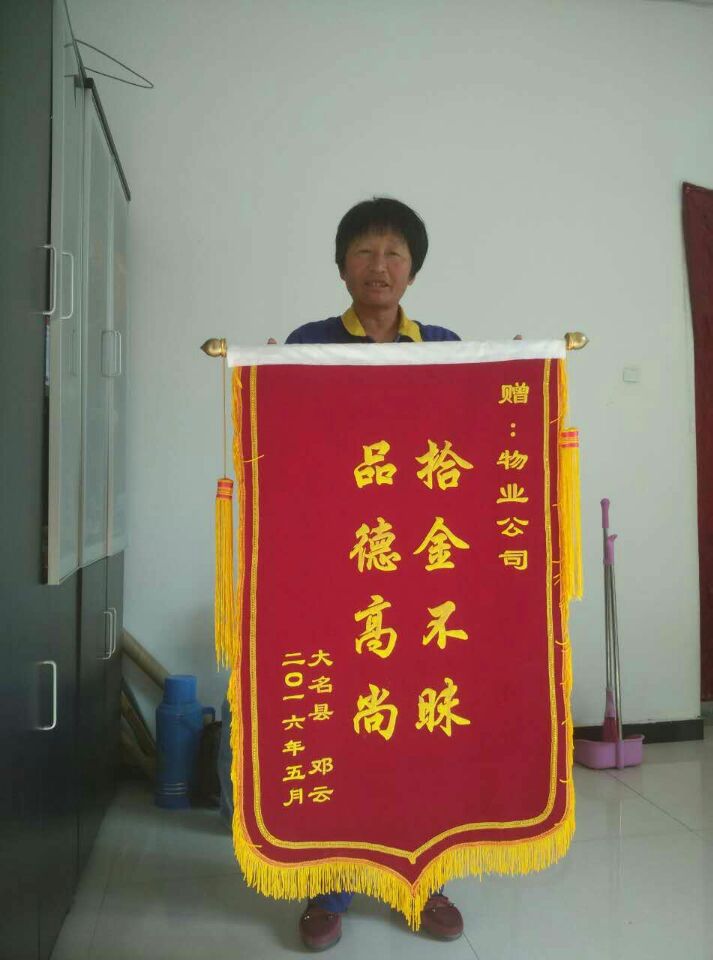 5月11日,邯鄲高科園區(qū)企業(yè)員工鄧云來到物業(yè)處,將一面寫有“拾金不昧 品德高尚”字樣的錦旗送到保潔工人郭愛手中,表達感激之情。