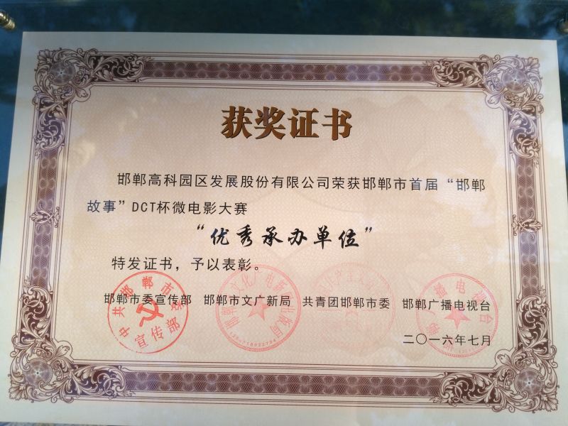 屆時(shí),邯鄲高科園區(qū)發(fā)展股份有限公司也榮獲“邯鄲市首屆‘邯鄲故事’DCT杯微電影大賽優(yōu)秀承辦單位”獎(jiǎng),邯鄲高科副總經(jīng)理李青代表公司參加了領(lǐng)獎(jiǎng)儀式。